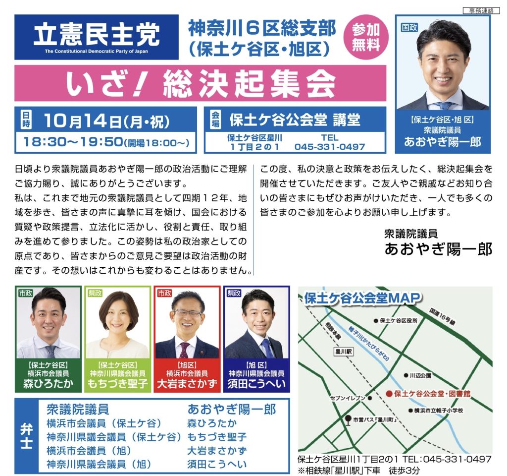 いざ!政権交代! 2024 9/18 活動ブログ 天王町・星川・桜ケ丘地域 政治を変える!暮らしを守る!今その時! 10月14日(月・祝)18時30分から保土ケ谷公会堂にて「いざ!総決起集会」を開催します!あらたな時代を切り拓くための思いと政策について熱く訴えてまいります!是非お誘い合わせの上ご来場ください! 活動ブログ 天王町・星川・桜ケ丘地域 よかったらシェアしてね! 山中市長へ提言! 政治を変える!暮らしを守る!いまその時! 関連記事 ほどがや区民まつり 2025年10月25日 令和8年度予算要望書を提出!! 2025年10月23日 見逃し配信🎬 2025年10月17日 週末は防災訓練や秋祭り! 2025年10月15日 信じる仲間と! 2025年10月15日 皆さまの声を! 2025年10月8日 バタバタな週末 2025年10月6日 週末フル回転! 2025年9月15日