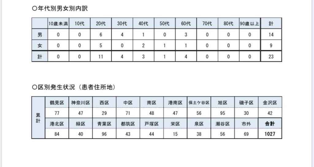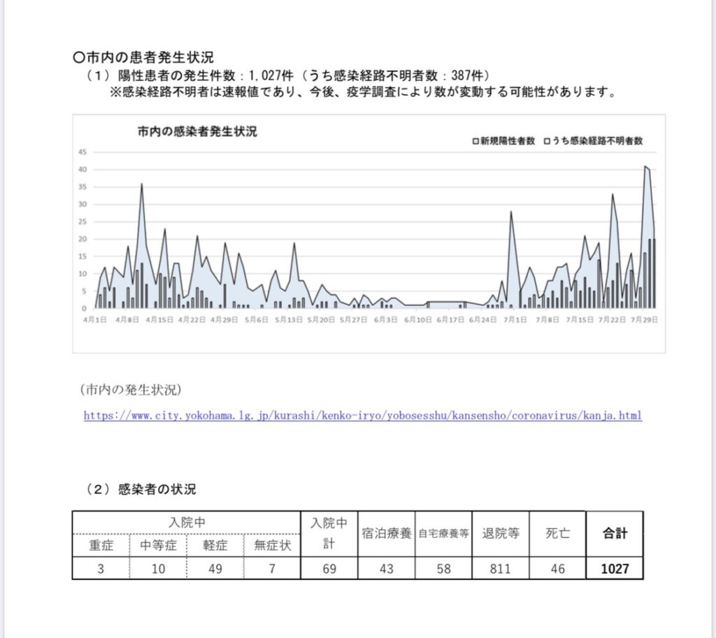 市内全体で累積1027名、保土ケ谷区においては58名と徐々に横浜・保土ケ谷にも感染が広がりつつある状況であり、爆発的な感染拡大に注意が必要です。