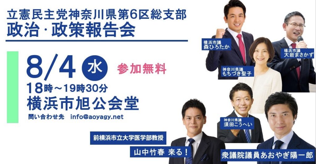 8月4日(水)18時から旭公会堂にて立憲民主党神奈川第6区総支部(保土ケ谷区・旭区)の政治・政策報告会を開催します!